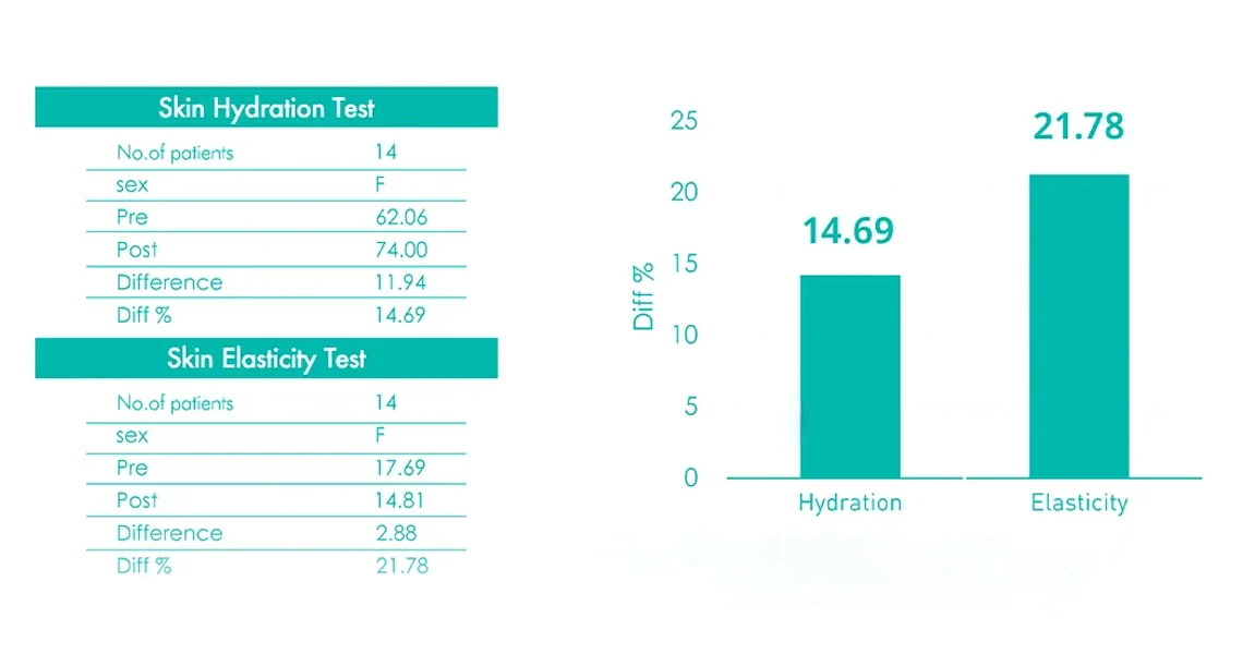 Clinical evaluations showed that after 4 weeks, participants who underwent the Rejuran Healer Program experienced average increases of +14.69% in hydration and +21.78% in elasticity — without volumizing or swelling effects.6,7