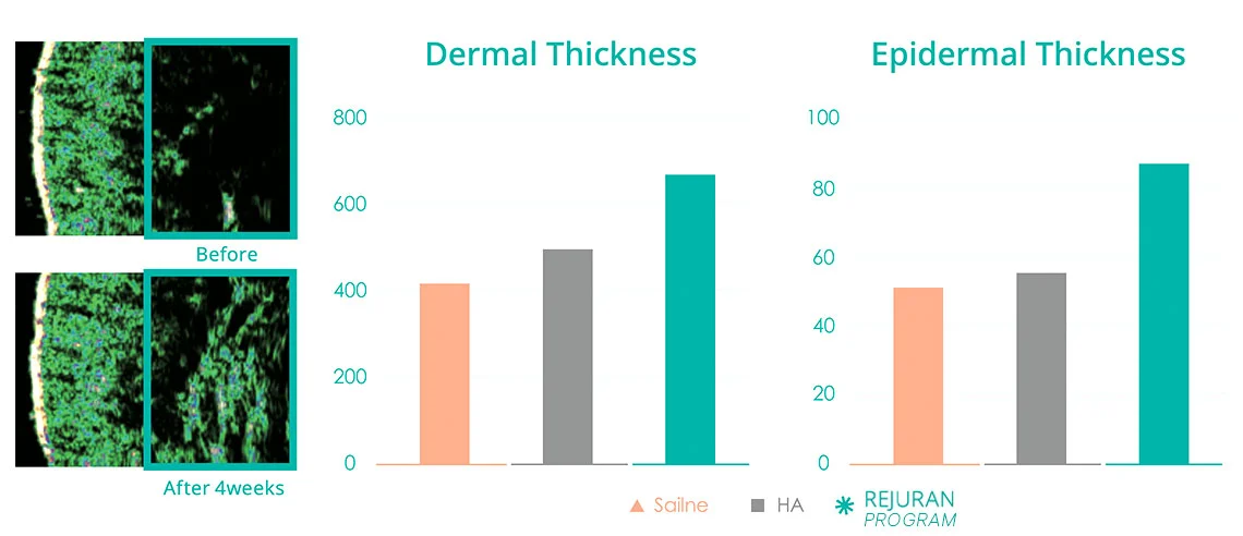 While hydration and surface texture are often the most noticeable effects, studies show that the Rejuran Healer Program also supports the deeper framework of the skin — its structure.